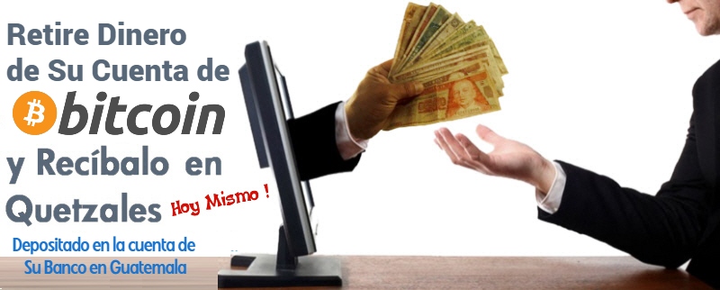 Este proceso consiste en llenar primero el formulario ubicado al final de esta página (en donde automáticamente se muestra la cantidad de quetzales que le depositaríamos, según el saldo que usted desee retirar de su dirección de Bitcoin), posteriormente le enviaremos un email confirmando si tenemos la disponibilidad de fondos para ofrecerle este servicio en ese momento y las indicaciones para que pueda trasladar su saldo de Bitcoin a nuestra dirección de Bitcoin, y dos horas después de habernos confirmado por email el traslado de fondos y su cuenta bancaria en los Bancos de Guatemala arriba listados, le realizaríamos el depósito en quetzales, a su cuenta monetaria o cuenta de ahorros del Banco Indicado.